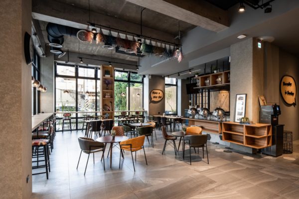 內部大廳整體由灰色調為主體並搭配木質感的櫃體,在手法上運用了線條的變化性,使整體空間有了放大且活潑的感覺,1F整排的落地窗將戶外的景觀帶入整體有著文青雅痞的風格,過道有著一整面書櫃是創辦者和設計師討論過後,手法的運用上是以中央不同角度的直線建構出一個動和外框的靜產生互動,使書櫃形成一個畫框,書與旅行者則是畫中的主角。